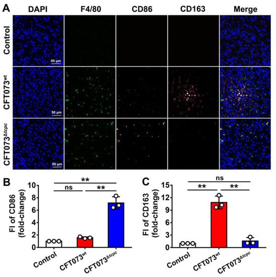CFT073wt infection inhibits CD86 but promotes CD163 in situ expression on macrophages in kidneys from PN mouse model. (A) The in situ expression of CD86 and CD163 on the surface of macrophages in kidneys from mouse PN model was observed by fluorescence microscope. Scale bar = 50 μm. One representative image of kidneys from 3 mice in each group was shown. (B) The fluorescence intensity (FI) analysis of CD86 in experiments shown in A. (C) FI of CD163 levels in experiments shown in A. Mean ± SD of data from three kidneys in each group are shown, n = 3. FI in the control group was set as 1.0. **: p < 0.01. ns: not significant.