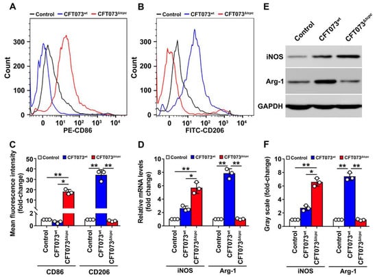 CFT073wt infection significantly inhibits CD86 and iNOS but promotes CD206 and Arg-1 expression in K-macrophages from PN mouse models. (A,B) Flow cytometry analyses to examine the expression of CD86 and CD206 on K-macrophages. (C) FI of CD86 and CD206 were analyzed by FlowJo v10.0.7 software. FI in the control group was set as 1.0. (D) mRNA levels of iNOS and Arg-1 in K-macrophages were detected by qRT-PCR. (E) Protein levels of iNOS and Arg-1 in K-macrophages were detected by Western blot. (F) Gray-scale analyses of bands reflecting iNOS and Arg-1 protein levels in experiments as described in E. Gray scale in the control group was set as 1.0, Mean ± SD of three independent experiments are shown. *: p < 0.05; **: p < 0.01.