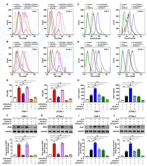 CFT073wt suppresses M1 but promotes M2 macrophage polarization in vitro. (A,B) The expression of M1 surface markers CD80 and CD86 in THP-1 and J774A.1 was detected by flow cytometry. (C,D) The expression of M2 surface markers CD163 and CD206 in THP-1 and J774A.1 was analyzed by flow cytometry. (E) The production of NO in THP-1 and J774A.1 was measured by Griess method. (F,G) The iNOS protein levels and bands’ gray-scale analyses in THP-1 and J774A.1, respectively. (H) The protein levels of Arg-1 in THP-1 and J774A.1 were detected by ELISA. (I,J) The protein levels of Arg-1 were detected by Western blot and bands’ gray-scale analyses in THP-1 and J774A.1, respectively. Gray scale in the control group was set as 1.0. Mean ± SD of three independent experiments are shown. *: p < 0.05; **: p < 0.01. NS: not significant.