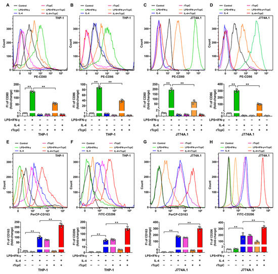 rTcpC inhibits M1 markers CD80 and CD86 but promotes the expression of M2 markers CD163 and CD206 in macrophages. (A–D) The effects of rTcpC on M1 surface markers CD80 and CD86 detected by flow cytometry and FI were analyzed by FlowJo v10.0.7 software. (E–H) The surface markers CD163 and CD206 of M2 polarized macrophages were detected by flow cytometry. Mean ± SD of three independent experiments are shown. **: p < 0.01.