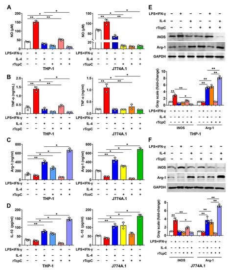 rTcpC suppresses the expression of proinflammatory factors and iNOS, but enhances the production of IL-10 and Arg-1 in macrophages. (A) The influences of rTcpC on NO in THP-1 and J774A.1 were detected by Griess method. (B–D) The expression levels of TNF-α, Arg-1 and IL-10 in THP-1 and J774A.1 were detected by ELISA. (E,F) The expression levels of iNOS and Arg-1 and bands’ gray-scale analyses in THP-1 and J774A.1, respectively. Gray scale in the control group was set as 1.0, Mean ± SD of three independent experiments are shown. *: p < 0.05; **: p < 0.01.