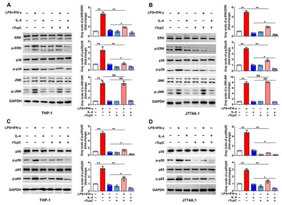 rTcpC inhibits the activation of MAPK/NF-κB pathway in macrophages. (A,B) Western blot to detect the effects of rTcpC on phosphorylation of ERK, p38, and JNK and bands’ gray-scale analyses in THP-1 and J774A.1, respectively. (C,D) Western blot analyses of phosphorylation of p50 and p65 and bands’ gray-scale analyses in THP-1 and J774A.1, respectively. Mean ± SD of three independent experiments are shown. *: p < 0.05; **: p < 0.01. NS: not significant.