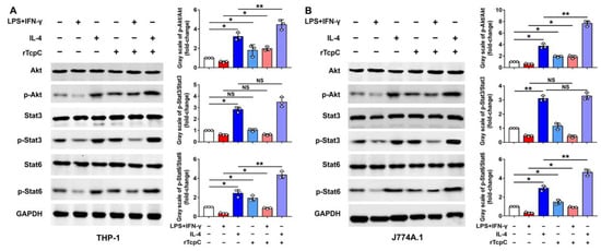 rTcpC promotes the activation of Akt/STAT pathway in macrophages. (A) Western blot analyses of the effects of rTcpC on phosphorylation of Akt, STAT3 and STAT6 and bands’ gray-scale analyses in THP-1. (B) Western blot to examine the influences of rTcpC on phosphorylation of Akt, STAT3 and STAT6 and bands’ gray-scale analyses in J774A.1. Mean ± SD of three independent experiments are shown. *: p < 0.05; **: p < 0.01. NS: not significant.
