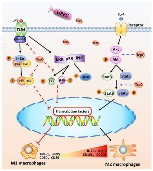 Although TcpC was demonstrated to play a crucial role by blocking the NF-κB pathway in the immune evasion of macrophage-mediated innate immunity [7,9], its influence on M1/M2 macrophage polarization remains unknown. Here, we show that TcpC inhibits M1 but promotes M2 macrophage polarization via the MAPK/NF-κB/STAT pathway in urinary tract infection. Our findings not only illuminate the molecular mechanisms by which TcpC regulates M1/M2 macrophage polarization, but also provide novel clues to clarify the pathogenicity of UPEC.