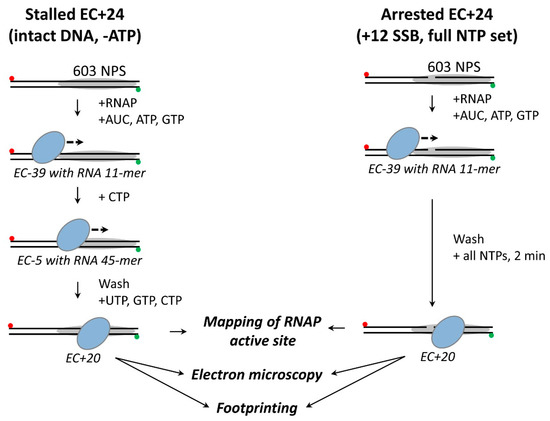 Most of the experiments described below require high amounts of homogeneous complexes that can only be obtained with E. coli RNA polymerase (RNAP) that uses the Pol II-specific mechanism of transcription through chromatin in vitro [44,48,66]. Although this experimental system has certain limitations [67], it recapitulates the authentic nucleosome-specific arrest of RNA polymerase on DNA containing SSBs [45]. Therefore, the experiments were conducted using bacterial polymerase as a convenient experimental model.