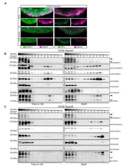 Tetraspanin 8 mediates TNFα shedding by ADAM17 in tetraspanin-enriched microdomains (TEM). (A) Stimulated Emission Depletion (STED) microscopy reveals presence of both ADAM17 and TNFα in Tspan8+ membrane microdomains. One representative out of three independent experiments is shown. (B,C) Tspan8 promotes recruitment of ADAM17 into tetraspanin-enriched microdomains. Parental (B) or Tspan8-deficient (C) HT29 cells were lysed with the indicated detergents and subjected to differential density centrifugation using a sucrose gradient. Flotillin served as a marker for lipid rafts in Triton X-100 lysed cells. Tetraspanin-enriched microdomains migrated at the same density as flotillin, as indicated by the presence of Tspan8 in HT29 cells. Black filled arrow heads: ADAM17 pro-form, black open arrow heads: ADAM17 mature form. Blue filled arrow heads: pro-TNFα, blue open arrow heads: processed TNFα. One representative out of three independent experiments is shown.