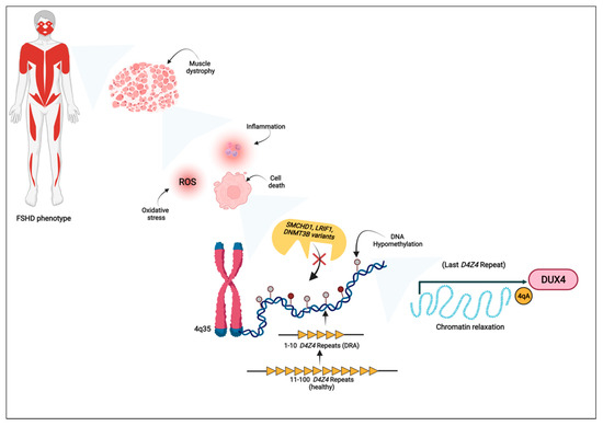 The main disease mechanisms and molecular determinants involved in FSHD etiopathogenesis. The figure illustrates how the FSHD phenotype results from the muscle dystrophy and dysfunction, which, in turn, are due to altered biological mechanisms such as cell death, inflammation and oxidative stress. The dysregulation of such pathways has been associated with DUX4 toxic expression. In presence of a 4qA permissive allele, DUX4 activation depends on the chromatin relaxation of the D4Z4 array that can result from the partial deletion of the D4Z4 repeated units, the occurrence of pathogenic variants within SMCHD1, LRIF1 and DNMT3B genes and the concomitant DNA hypomethylation. DRA: D4Z4 reduced allele; ROS: reactive oxygen species. Created with Biorender.com, accessed on 15 July 2022.