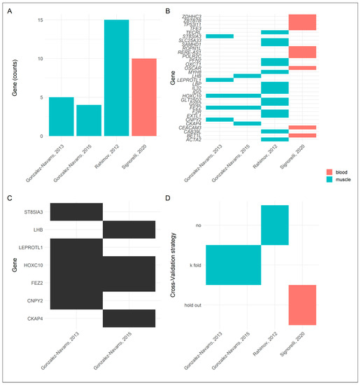 A comparison of gene-expression-based AI models with data attained from (Gonza-lez-Navarro et al., 2013 [117], Gonza-lez-Navarro et al., 2015 [118], Rahimov 2012 [81] and Signorelli 2020 [103]). (A) Bar plot indicating the number of DEGs found in the considered studies. Up to 15 DEGs representing potential biomarkers for FSHD were identified across 4 studies. (B) Tile plot indicating which genes were found by the considered studies. All of the genes identified in blood (red) were not retrieved in the other studies based on muscle biopsies (blue), and this may be due to the different levels of gene expression of the two biological samples. However, only two genes of 15 were identified both from Gonzalez-Navarro et al., 2013 and Gonzalez-Navarro et al., 2015 across the experiments performed on muscle data. (C) Tile plot with a focus on the studies by Gonzalez-Navarro et al. The studies proposed by these authors were performed on the same dataset and used the same SVM algorithm. Despite these favorable conditions, only 2 out of 7 DEGs were confirmed. (D) Tile plot to visualize the cross-validation strategies used in FSHD vs. HD modeling, suggesting that the performance metrics used may be inflated by the low sample size (12 < n < 54).