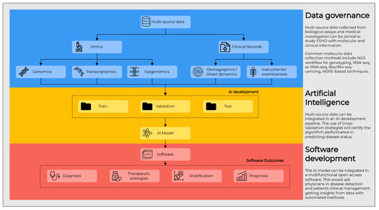 Combining and analyzing multimodal data to train accurate models and XAI methods to investigate their behavior would finally lead to highlighting relevant mechanisms underlying FSHD pathogenesis. The development of software tools would be advantageous for the specialists involved in FSHD patients management. The ideal AI-based tool would be able to take into account data from different sources, such as genetic variants, D4Z4 size and haplotype, DNA methylation status and FSHD-related transcriptome signatures, MRI, clinical records and demographics, finally providing predictions and summaries to clearly show the patient status. This would facilitate a proper monitoring of the disease stage over time in the FSHD trajectory. Thus, not only would such a software aid the diagnosis, but it would also give support in patients’ stratification and prediction of prognosis, as well as in the choice of therapeutic strategies, thus constituting a proper multifunctional tool. Of note, considering that unknown targets and mechanisms could be discovered concerning FSHD pathogenesis, such a tool should be flexible and open to implementations with novel data (Figure 3).