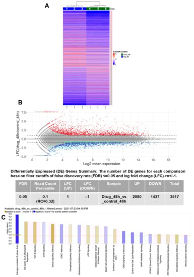 RNA-seq and transcriptome analyses demonstrate modulation of several pathways in favor of PCa inhibition upon treating CWR22Rv1 cells with VNPP433-3β. (A) Heatmap of the differentially expressed genes in 10 µM VNPP433-3β-treated CWR22Rv1 cells (lanes 4–6) for 48 h compared to the control (lanes 1–3), illustrating the clustering for each comparison of interest based on the Gene Expression Counts and Log Fold Change (LFC) for the Differentially Expressed Genes (DEGs). Columns correspond to samples and rows correspond to genes. Scale bar represents a graded change in LFC where pink is higher LFC, gray is lower LFC. Gene expression values were derived from DESeq/DESeq2 normalized counts. (B) MA Plot showing the relationship between expression change (LFC, M) and average expression (log2 mean expression, A). Red points indicate the upregulated genes with FDR ≤ 0.05 and LFC ≥ 1 and blue points indicate downregulated genes with false discovery rate (FDR) ≤ 0.05 and log2-fold-change ≥ ±1. Dashed lines indicate the LFC cutoff values of ±1. Points colored in gray indicate the genes that are not significantly differentially expressed. Table shows the number of genes differentially expressed. (C) QIAGEN Ingenuity Pathway Analysis shows that VNPP433-3β steered the transcription of multiple canonical pathways genes in favor of PCa inhibition. A positive z-score (orange bars) indicates the activation of the given pathway, and a negative z-score (blue bars) reflects the suppression of that pathway.