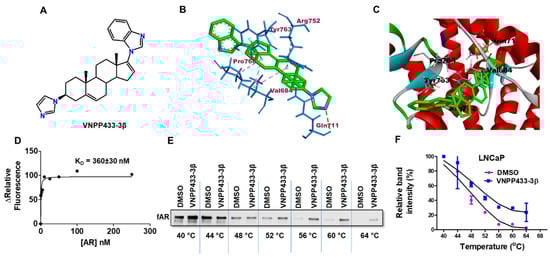 Molecular interaction of VNPP433-3β with AR. (A) Chemical structure of VNPP433-3β. (B) Molecular docked pose of VNPP433-3β in the ligand binding domain of AR showing the interacting amino acid residues. Gibb’s free energy of binding (ΔG°) = −8.3 kcal/mol. (C) Protein surface and ligand-binding groove of the AR bound with VNPP433-3β. (D) Change in relative fluorescence (ΔF) of VNPP433-3β upon binding AR LBD as a function of increasing concentration of AR LBD. (E) Thermal stabilization of AR protein upon ligand binding was measured by CETSA in LNCaP cells. Representative western blot of CETSA-AR in LNCaP cells treated with VNPP433-3β (10 µM). (F) Apparent melting curve of AR: graph was plotted as a function of temperature used in heat treatment. All experiments were performed three times independently and data is given as average ± S.E.M. The solid lines represent the best fits of the data to the Boltzmann sigmoid within the GraphPad Prism software.