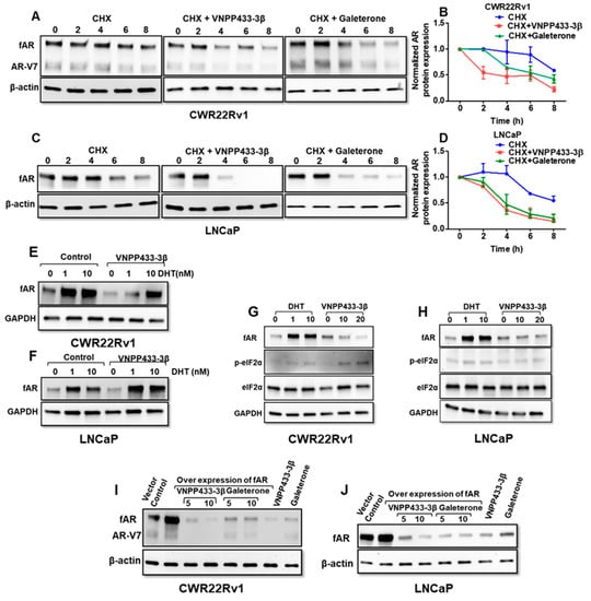 Evaluation of half-life of AR in presence of VNPP433-3β using eukaryotic translation inhibitor cycloheximide (CHX). Androgen-deprived CWR22Rv1 (A) and LNCaP (B) cells were treated with 10 μM CHX and 10 μM VNPP433-3β or vehicle control for the duration as indicated (0, 2, 4, 6, 8 h), 40 μg protein was separated by SDS-PAGE and subjected to immunoblotting. (C,D) AR protein expression was quantified and normalized with β-actin and plotted. Androgen-deprived CWR22Rv1 (E) and LNCaP (F) cells were treated with DHT (1 or 10 nM) in presence or absence of VNPP433-3β (10 μM) overnight and immunoblotted for AR and GAPDH. Androgen-deprived CWR22Rv1 (G) and LNCaP (H) cells were treated with DHT (1 or 10 nM) in the presence or absence of VNPP433-3β (10 μM) overnight and lysates were immunoblotted for AR, p-eIF2α, eIF2α, and GAPDH. CWR22Rv1 (I) and LNCaP (J) cells were transfected with a plasmid that overexpresses full-length AR and treated with VNPP433-3β or Gal (5, 10 μM) for 24 h and immunoblotted for AR.