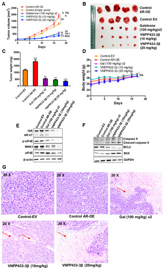 Effect of VNPP433-3β in AR-over expressing 22Rv1 castration-resistant prostate cancer xenograft in vivo model. (A) Tumor volume in the test animals: NRG mice bearing 22Rv1 tumor xenografts that stably overexpress AR were orally administered with vehicle (40% β-cyclodextrin in saline, PO), galeterone (100 mg/kg, twice a day) and VNPP433-3β (10 or 20 mg/kg)- 5 days a week for 17 days. Tumor size was measured thrice a week using digital calipers and volume was calculated using the formula length × width 2 × 0.5 (mm3) and plotted against time (days of treatment). Tumor growth inhibition (TGI) is calculated based on initial tumor volume (100%) and tumor volume in AR-OE control at the end of the experiment (0%). The results are represented as means ± SEM as error bar. ns p = 0.4056, ** p = 0.0030, *** p = 0.0001 (compared to Control AR-OE). (B) Excised tumors from all animals in each group were photographed. (C) Mean weight of excised tumor in each group with SE bars at the end of the study. (D) Mean body weight of animals during the study period in each group. (E) Western blot analyses of key proteins involved in mechanism of action of VNPP433-3β in the excised tumors. (F) Level of key apoptotic proteins in tumor samples affected by VNPP433-3β treatment. (G) Histological examination of excised tumors following Hematoxylin-Eosin (H and E) staining. Nuclei stains blue (large in number in proliferating control tumor) and cytoplasm/extracellular matrix stains pink (red arrows) indicative of tumor regression upon drug treatment.