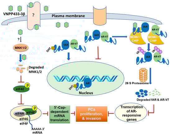 Graphical representation of the mechanism of action of VNPP433-3β in PCa inhibition. VNPP433-3β binds the AR, prevents its translocation into the nucleus, and redirects it to ubiquitination by MDM2/CHIP and subsequent degradation by 26 S proteasome thereby affecting transcription of AR-responsive tumor genes and affecting PCa inhibition. Additionally, VNPP433-3β impedes phosphorylation of eIF4E by depleting MNK1/2 that in turn limits 5′-cap-dependent translation and blocks PCa progression.