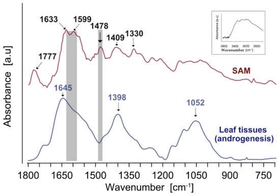 Averaged infrared spectra of leaf tissues (Figure 1 lower) showed the most pronounced broadband in the Amide I region, centered at 1645 cm−1, possibly due to C-C, C=C, C-N stretching, and NH2 deformation. Two complex bands in the fingerprint region were present at 1398 and 1052 cm−1. The former could be assigned to vibration modes also attributed to SAM, while the latter was mainly from sugars and structural polysaccharides (the C-C, C-O, and C-C-O stretching) (polysaccharides []). The spectra of leaves showed relatively broadband with overlapping absorbances from various chemical compounds in the tissues. Not all FTIR bands detected for SAM were visualized on the leave spectra. Still, they were implemented in the structural equation modeling to identify the regions reflecting SAM vibrations and fit the postulated model. Furthermore, the range of wavenumbers corresponding to absorbances (summarized over 10 cm−1 bands) characteristic of SAM was tested (the most relevant signals from SAM are shaded grey in Figure 1).