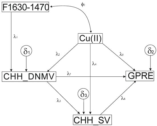 The hypothesized model includes direct, indirect, and total effects (Table 6). The GPRE variable showed the greatest dependence on Cu (II) (direct: β = 0.9863 and total: β = 0.9863 with negative indirect: β = −0.1712 effects). The CHH_SV depended negatively on Cu (II) (β = −0.518 (direct); β = −0.3972 (total) and indirect β = 0.1208 effects)) but positively on CHH_DNMV (β = 0.4131 direct and total effects). The CHH_DNMV was mostly affected by F1630…1470 via direct and total effects (β = 0.3669). Finally, the direct effect of Cu (II) (β = 0.2924) on CHH_DNMV was observed.