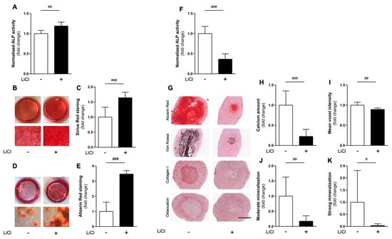 Figure 6. Different responses to cWnt agonist in monolayer and spheroid cultures. (AE) Effect of LiCl on MC3T3-E1 cells cultured in 2D: determination of alkaline phosphatase (ALP) activity after 14 days of culture without (-) or with (+) 5 mM LiCl (A). Representative Sirius Red stainings after 21 days with macroscopic photographs of wells (top) and respective micrographs (bottom) (B) and corresponding spectrophotometric quantification of total collagen content upon dye extraction (C). Corresponding Alizarin Red staining (D) with quantification of calcium deposition (E). Scale bars show 100 µm. (FK) Comparison of lithium-mediated effects in 3D-cultured MC3T3-E1 cells. ALP activity after 14 days (F), representative immuno-/histochemically stained sections (i.e., Alizarin Red, Von Kossa, type I collagen, osteocalcin, from top to bottom) after 21 days. Quantified extracellular calcium content in spheroids after 21 days (H) and corresponding micro-CT analyses: mean voxel intensity (I), volumetric quantification of moderate (J) and strong mineralization levels (K). For details see legend to Figure 3. Scale bars are 200 µm. Significant differences were evaluated using Student’s t-test (n = 6). # p < 0.05, ## p < 0.01, ### p < 0.001 as indicated. Data represent geometric mean ± 95% CI.