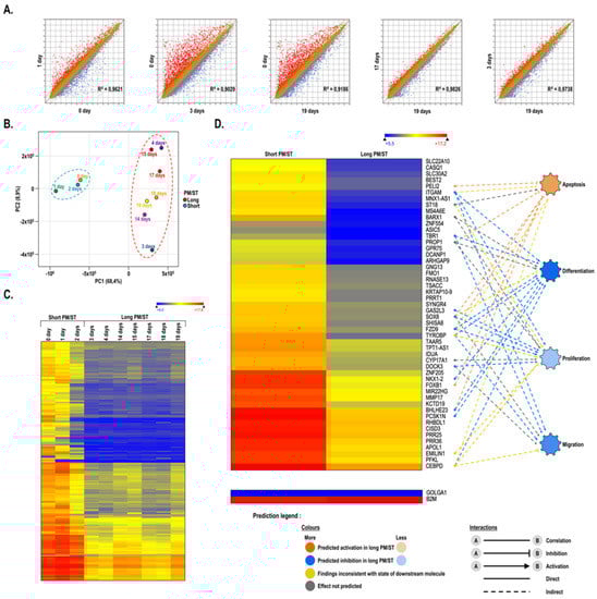 3.2. Gene Interaction Network Assisted in Silico Predictions of Biological Functions Regulation in Short and Long PM/ST hLECs Cultured in Monolayers