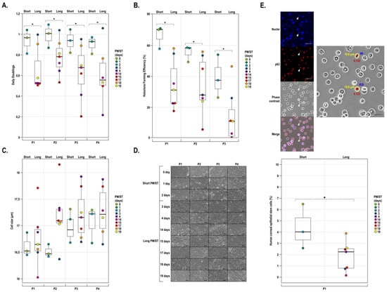HLECs were cocultured in a monolayer with iHFL in DHc in order to evaluate the PM/ST impact on the growth rate, colony-forming efficiency, size, and morphology of these cells. As hLECs are usually cultured for up to two or three passages when used for clinical purposes, we subcultured them until they reached P4. As shown on Figure 3A, the growth rate was affected by the PM/ST at all passages. Indeed, SPM/SThLECs displayed increased daily doublings when compared with LPM/SThLECs (Figure 3A). A strong tendency could be detected (p-value: 0.0523) and those differences were maintained over passages in culture (P1 to P4).