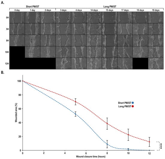As no study ever examined the impact of the PM/ST on the dynamic of corneal wound healing, hLECs were grown as monolayers and scratch-wounded. Figure 4A shows that several wounded monolayers of cells from the LPM/SThLECs group (LPM/SThLEC-4, -14, -15, and -19 days) suffered from a severely delayed wound closure as most damages had not completely closed at 12 h postinjury. Statistically significant differences in the wound closure kinetic were observed between both conditions (p-value: 0.0005) and were maintained over time (for 5, 8, 10, and 12 h; Figure 4B). This can be explained by the fact that all SPM/SThLECs populations (SPM/SThLEC-0, -1, and -2 days) were completely healed between 8 and 10 h, in comparison with LPM/SThLECs, which, for most of them, needed more than 12 h for a complete wound closure to occur.