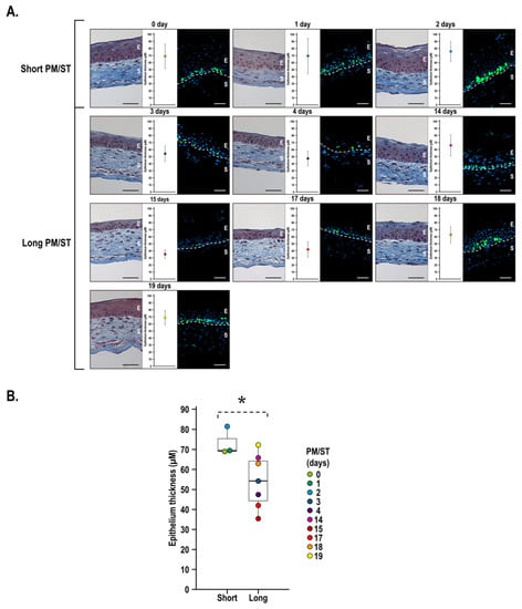 Analysis of morphology and thickness of the stratified corneal epithelium when short and long PM/ST hLECs are used to produce human-tissue-engineered corneas (hTECs). Human-tissue-engineered corneas (hTECs) were reconstructed by seeding hLECs with various PM/STs over reconstructed stroma to produce a 3D construct. (A) Histology (Masson’s trichrome staining), epithelium thickness (µm), and Ki-67 (immunofluorescence) analyses of SPM/SThTECs (short PM/ST: 0, 1, and 2 days) and LPM/SThTECs (long PM/ST: 3, 4, 14, 15, 17, 18, and 19 days). (B) Graph of mean epithelium thickness of SPM/SThTECs (short) and LPM/SThTECs (long). E: epithelium; S: stroma. Scale bars: 50 µm. p-value: * < 0.08.