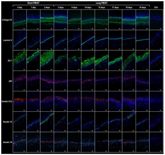Immunofluorescence analysis of human-tissue-engineered corneas (hTECs) produced using hLECs with short and long PM/ST. Human-tissue-engineered corneas (hTECs) were reconstructed by seeding hLECs with various PM/STs over reconstructed stroma to produce a 3D construct. Immunofluorescence staining of epithelial basement membrane components (collagen IV and laminin 5), corneal epithelial cell junctions (ZO-1) epithelial tissue development regulator (p63), differentiation marker for corneal epithelial cells (K3 and K12), and poorly differentiated corneal epithelial cells (K15 and K19) in both SPM/SThTECs (short PM/ST: 0, 1, and 2 days) and LPM/SThTECs (long PM/ST: 3, 4, 14, 15, 17, 18, and 19 days). Ctrl-: immunofluorescence without primary antibody. Scale bar: 20 µm.