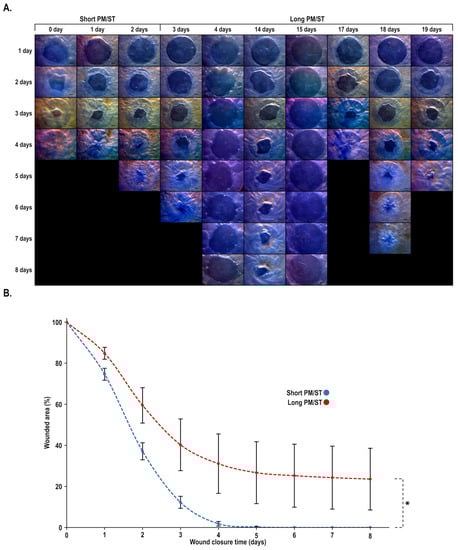 Impact of hLECs PM/ST on human-tissue-engineered corneas (hTECs) wound closure. Human-tissue-engineered corneas (hTECs) were reconstructed by seeding hLECs with various PM/STs over reconstructed stroma to produce a 3D construct. (A) Both SPM/SThTECs (short PM/ST: 0, 1, and 2 days) and LPM/SThTECs (long PM/ST: 3, 4, 14, 15, 17, 18, and 19 days) were wounded using an 8 mm biopsy punch and allowed to recover in culture at the air/liquid interface. Corneas were photographed each day (days 0 to 8) to monitor wound closure. (B) Graph of the percentage of wound surface area remaining as a function of time for each condition (n = 4). Scale bar: 1 mm. p-value: * < 0.05.