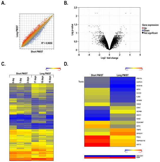 We next conducted gene expression profiling on microarrays using total RNA prepared from hTECs constructed using SPM/SThLEC-0, -1, and -2 and LPM/SThLEC-17, -18, and -19 hLECs and compared the pattern of expressed genes between those assembled using hLECs with either short (SPM/SThTECs) or long (LPM/SThTECs) PM/STs. Scatterplot analyses revealed restricted changes in the pattern of genes expressed by LPM/SThTECs relative to SPM/SThTECs as indicated by the minor variations noted in the slope of the regression curve (Figure 8A; R2 = 0.9650). A volcano plot showing a threefold (Log FC 1.58) or more expression variation between SPM/SThTECs and LPM/SThTECs was then generated (Figure 8B). Consistent with the data from the scatter plot analysis, only 19 genes, with p-values < 0.05, fitted into that category of differentially regulated genes between both types of hTECs. A heatmap for all the genes showing a threefold or more gene expression variation between SPM/SThTECs and LPM/SThTECs was then generated (Figure 8C). Unlike the data yielded when hLECs were grown in monolayers (Figure 1C), the pattern of genes differentially regulated by more than threefold was clearly more uniform between SPM/SThTECs and LPM/SThTECs. We then examined the data files from the microarrays to sort out the most differentially regulated genes (p-values < 0.05) between SPM/SThTECs and LPM/SThTECs (Figure 8D). Of the 19 genes identified as differentially expressed between the two groups, several are known to encode products that influence hLECs migration, proliferation, and extracellular matrix remodelling (SPOCK1, TMPRSS11B, CLCA4, SPINK8, CAPN1, IL36A, and PSCA) [,,,,,,]. In addition, 2 of these 19 genes encode keratins (KRT4, KRT13) whose respective expression was considerably higher in hTECsPM/ST than in hTEClPM/ST.