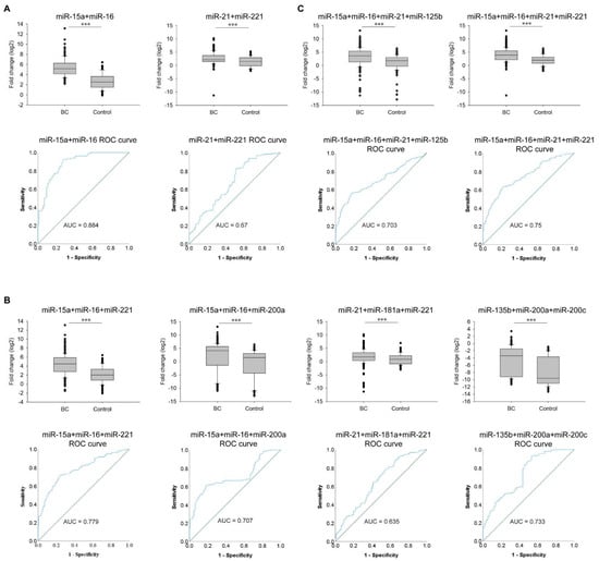 Fold change (log2) and ROC curve analysis of multiple miRNAs expression in BC patients (BC) compared with healthy individuals (Control). Combined expressional and ROC curve analyses of A) two correlated miRNAs, B) three correlated miRNAs, and C) four correlated miRNAs, *** p < 0.001. Error bars represent the standard deviation of each miRNA measured on either the group of BC patients (BC) or healthy individuals (Control). Blue line represents the ROC curve, and the diagonal line depicts the line of no-discrimination.