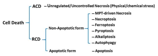 Classification of cell death. ACD: accidental cell death; RCD: regulated cell death; MPT: mitochondrial permeability transition pore.
