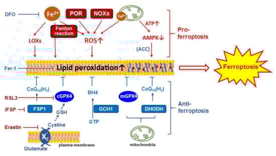 Regulatory mechanism of ferroptosis. Ferroptosis is induced by iron-dependent lipid peroxidation in plasma or mitochondrial membrane. Pro-ferroptosis (red) and anti-ferroptosis (blue) pathways are shown. Well-used ferroptosis inducers (e.g., RSL3, iFSP, and Erastin) and inhibitors (e.g., DFO and Fer-1) and their targets are indicated. The accumulation of cytosolic and mitochondrial iron, increased ROS, and lipid peroxidation promote ferroptotic cell death. DFO: deferoxamine; POR: P450 oxidoreductase; NOX: NADPH oxidases; LOX: lipoxygenase; ROS: reactive oxygen species; AMPK: AMP-activated protein kinase; ACC: acetyl-CoA carboxylase; Fer-1: ferrostatin-1; CoQ10: coenzyme Q10; RSL3: RAS-selective lethal 3; GPX4: glutathione peroxidase 4; FSP1: ferroptosis suppressor protein 1; DHODH: dihydroorotate dehydrogenase; GSH: glutathione; GCH1: GTP cyclohydrolase 1; BH4: tetrahydrobiopterin.