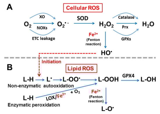 Generation of cellular (A) and lipid (B) ROS. See text for details. XO: xanthine oxidase; NOXs: NADPH oxidases; ETC: electron transport chain; O2•−: superoxide; SOD: superoxide dismutase; H2O2: hydrogen peroxide; Prx: peroxiredoxin; GPXs: glutathione peroxidases; HO•: hydroxyl radical; L-H: lipid; L•: lipid radical; L-OO•: lipid peroxyl radical; L-OOH: lipid peroxides; L-O•: lipid alkoxyl radicals; L-OH: lipid alcohol; LOX: lipoxygenase.
