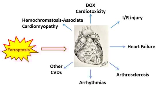Possible implication of ferroptosis in cardiovascular disease. DOX: doxorubicin; I/R: ischemia-reperfusion; CVD: cardiovascular disease. The sketch of heart was a generous gift from Dr. Natthaphat Siri-Angkul.