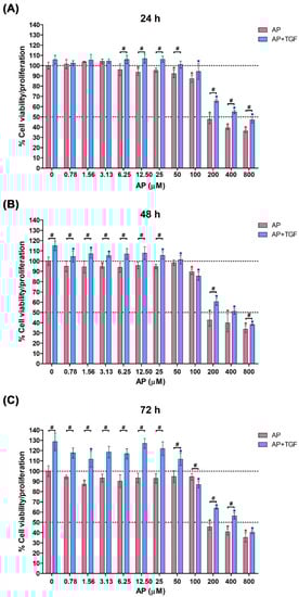 Alpinetin (AP) inhibits proliferative responses of human primary dermal fibroblasts (HPDFs) to TGF-β1. Cell viability assay of HPDFs treated with AP (0–800 µM) with or without the presence of 10 ng/mL TGF-β1 at 24 h (A), 48 h (B), and 72 h (C). Data are averages from three independent experiments and represented as mean ± SD of three independent experiments; # p < 0.05 or * p < 0.05 (red asterisk (compared to the untreated group), and blue asterisk (compared to TGF-β1-treated group)).