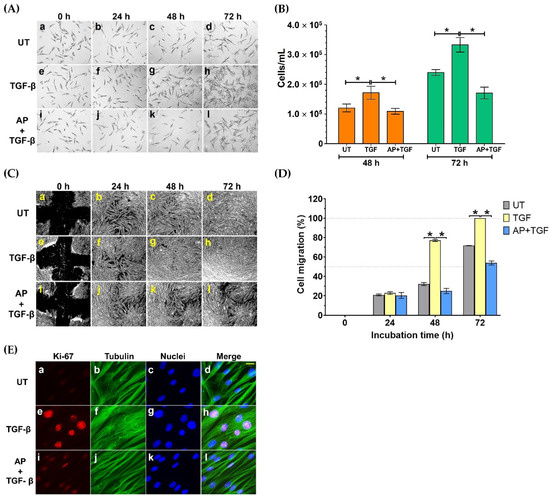 To test this hypothesis, we treated HPDFs (seeded at low numbers of cells) with TGF-β1 and AP and observed their cell density over 72 h by a phase-contrast microscope. As presented in Figure 2A(e–h), 10 ng/mL TGF-β1 progressively increased cell density over time compared to the untreated cells (Figure 2A(a–d)); nevertheless, AP drastically suppressed this effect of TGF-β1 on enhancing cell density (Figure 2A(i–l)). The microscopic observation was verified by results from direct cell counting, where cell numbers at 48 and 72 h of the untreated (UT) HPDFs cultured in the serum-free media were 1.21 × 105 ± 1.33 × 104 cells/mL and 2.40 × 105 ± 9.73 × 103 cells/mL, respectively (Figure 2B). However, at these two time points TGF-β1 (10 ng/mL) significantly increased the number of HPDFs to 1.72 × 105 ± 2.19 × 104 cells/mL and 3.33 × 105 ± 2.45 × 104 cells/mL, respectively (Figure 2B). As expected, with the presence of AP, number of TGF-β1-stimulated HPDFs at 48 and 72 h were suppressed to 1.09 × 105 ± 9.60 × 103 cells/mL and 1.71 × 105 ± 1.97 × 104 cells/mL, respectively (Figure 2B). Data from cell migration assay also confirmed that cell migration of TGF-β1-stimulated HPDFs over the course of 72 h was accelerated (Figure 2C(e–h)) compared to that of the untreated HPDFs (Figure 2C (a–d)). As expected, AP could significantly reduce percent migration of TGF-β1-stimulated HPDFs (Figure 2C (i–l)); especially at 48 h and 72 h (Figure 2D). Moreover, to support our findings, we performed an immunofluorescence study to examine the expression level and localization of the Ki-67 protein, because this protein is associated with cell cycle progression and highly expressed in cells that are in the proliferative phase. Results clearly showed that HPDF cells treated with TGF-β1 exhibited high expression of the Ki-67 protein in their nuclei (Figure 2E(e–h)), in comparison to the basal level in the nuclei of the untreated cells (Figure 2E(a–d)). Undoubtedly, the nuclear expression of the Ki-67 protein in TGF-β1-treated HPDFs was drastically reduced when AP was present (Figure 2E(i–l)). These results indicate that AP possesses anti-proliferative effects against the influence of TGF-β1.