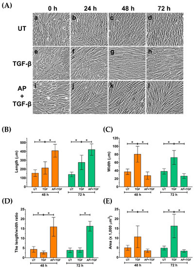 AP inhibits morphological changes in HPDFs from fibroblast to myofibroblast-like structure in response to TGF-β1 stimulation. (A) Morphological changes in HPDFs (untreated, TGF-β1-treated, or TGF-β1-treated with the presence of 50 μM of AP) observed by a phase-contrast microscope at 0 h, 24 h, 48 h, and 72 h. Figure A(a–d) present the untreated cells at 0 h, 24 h, 48 h, and 72 h, respectively. Figure A(e–h) present TGF-β1-treated cells at 0 h, 24 h, 48 h, and 72 h, respectively. Figure A(i–l) present cells treated with TGF-β1 and 50 μM of AP at 0 h, 24 h, 48 h, and 72 h, respectively. Quantitative analysis of cell length (B), cell width (C), the length/width ratio (D), and area of HPDFs (E). Data are averages from three independent experiments; * p < 0.05 compared to the TGF-β1-treated HPDFs.