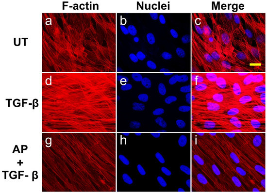 On the basis that actin stress fibers are responsible for cell morphological changes, we monitored the expression and organization of filamentous actin using DyLight TM 594-Phalloidin and the appearance of the nuclei using DAPI. We observed that HPDFs exposed to different treatments demonstrated diverse types of assembly and structure of actin cytoskeleton (Figure 4). After 72 h, HPDFs cultured in media without any treatment demonstrated moderate levels of short and thin actin fiber formation with decent numbers of overlapping areas (Figure 4a–c). Treatment of the fibroblasts with TGF-β1 for 72 h resulted in a tremendous development of thick and elongated actin filaments with distinct and dramatic reorganization. Specifically, TGF-β1 treatment created dense arrays of stress fibers, and these cross-linked networks of filamentous actin were distributed in different layers (Figure 4d–f). The nuclei of TGF-β1-treated HPDFs were oval and aligned randomly in different directions (Figure 4e,f). Interestingly, TGF-β1-treated HPDFs with the presence of AP over 72 h demonstrated less prominent development of stress fibers. The bundles of actin filaments were noticeably elongated, and the cross-linked networks of filamentous actin in different layers disappeared, causing cells to be in a stretching form (Figure 4g–i). Concomitantly, the nuclei of these cells were elongated oval, and their orientation was likely unidirectional (Figure 4h,i).