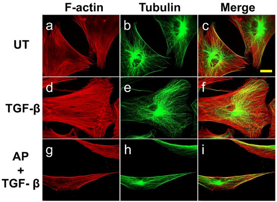 Much like the untreated cells, microtubules in TGF-β1-treated cells appeared intact, emanating from the cell center, and they seemed to be adapted to the changes in cell volume. However, minor restructure of the filaments was observed at the veil-like protrusions, suggesting their migratory organization in coordination with actin filaments (Figure 4e,f). Nevertheless, the presence of AP over the course of TGF-β1 treatment inhibited the formation of these cellular skeletal structures. In particular, AP altered TGF-β1-treated cells to be elongated at both poles, exhibiting a symmetrical cone shape (Figure 5g–i). The abundance of actin stress fibers was reduced (especially at the cell center), but sparse bundles of stress fibers were detected at both elongated poles. Remarkably, AP effectively inhibited the TGF-β1-stimulated formation of lamellipodia. Moreover, one characteristic similar to that of the untreated cells was the formation of thick, sharp, and straight lines of actin filaments and microtubules along the cell edges (Figure 5i).