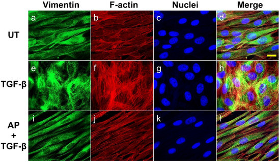 We further determined the abundance and cellular organization of vimentin-positive intermediate filaments, which are distinct mesenchymal features of myofibroblasts. We found that the untreated dermal fibroblast expressed a decent level of vimentin, and the cytoplasmic organization of the filament was seen as a diffused signal along the spindle shape of the cells demonstrating classical vimentin filament structures (Figure 6a–d). A strong increase in signal intensity indicating the upregulation of vimentin was detected in TGF-β1-stimulated cells, and a unique intermediate filament organization was observed. Specifically, TGF-β1-stimulated dermal fibroblasts exhibited dense vimentin filaments which were well-organized in a circular fashion around the nuclei of the cells (Figure 6e–h). Apparently, these vimentin networks were in line with prominently thick actin filament mesh works (Figure 6f–h). However, AP treatment completely blocked the effects of TGF-β1 on vimentin cytoskeletal alterations in dermal fibroblasts. These fibroblasts showed a diffused vimentin signal in the cytoplasm along the axis of the cell body, which was discrete, elongated, and aligned with fewer and thinner filamentous actin (Figure 6i–l).