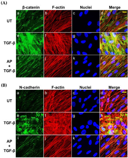 AP suppresses the synthesis and inhibits the organization of β-catenin and N-cadherin in response to TGF-β1 induction. (A) HPDFs (untreated, TGF-β1-treated, or TGF-β1-treated with the presence of 50 μM of AP) at 48 h were stained for β-catenin (green), F-actin (red), and nuclei (blue). (B) HPDFs (untreated, TGF-β1-treated, or TGF-β1-treated with the presence of 50 μM of AP) at 48 h were stained for N-cadherin (green), F-actin (red), and nuclei (blue). Figure A(a–d) present the untreated cells showing β-catenin staining, F-actin staining, DAPI staining, and merged images, respectively. Figure A(e–h) present TGF-β1-treated cells showing β-catenin staining, F-actin staining, DAPI staining, and merged images, respectively. Figure A(i–l) present cells treated with TGF-β1 and 50 μM of AP showing β-catenin staining, F-actin staining, DAPI staining, and merged images, respectively. Figure B(a–d) present the untreated cells showing N-cadherin staining, F-actin staining, DAPI staining, and merged images, respectively. Figure B(e–h) present TGF-β1-treated cells showing N-cadherin staining, F-actin staining, DAPI staining, and merged images, respectively. Figure B(i–l) present cells treated with TGF-β1 and 50 μM of AP showing N-cadherin staining, F-actin staining, DAPI staining, and merged images, respectively. Observation was conducted at 40 X magnification. Scale bar = 500 µm.