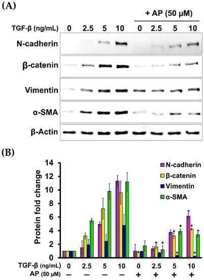 Since it has been demonstrated that TGF-β1 potently induces the expression of β-catenin and N-cadherin in fibroblasts from many tissues, we then evaluated the effects of AP on reducing the production of these two proteins. As presented in Figure 7, the untreated cells cultured in serum-free media showed low basal level of β-catenin and N-cadherin. Upon TGF-β1 treatment, the expression of β-catenin and N-cadherin was increased when the concentration of TGF-β1 was increased. TGF-β1 at the highest concentration (10 ng/mL) maximally upregulated the expression of β-catenin and N-cadherin to approximately 9-fold and 11-fold, respectively (Figure 8A,B). Dermal fibroblasts stimulated with TGF-β1 with the presence of AP at 12.5, 25, and 50 μM resulted in a significant decrease in β-catenin and N-cadherin signal intensity and inhibition of their organization (Figure 8A,B). Moreover, we confirmed our Western blot data with immunofluorescence and visualized that the intensity of β-catenin and N-cadherin in the untreated cells was weak, with their main localization at the cell–cell contact (Figure 7A(a–d),B(a–d)). In contrast, TGF-β1 strongly enhanced the positive signal of β-catenin and N-cadherin in the cells, especially at the areas of cell–cell interaction where they exhibited special organization patterns (Figure 7A(e–h),B(e–h)). Remarkably, AP treatment could effectively reduce the intracellular signal, and the staining patterns of β-catenin and N-cadherin were relatively similar to those of the untreated fibroblasts (Figure 7A(i–l),B(i–l)). Consistent with these findings, we observed that AP could greatly repress the TGF-β1-induced expression of α-SMA and vimentin, which are crucial markers of dermal fibrosis (Figure 8A,B).