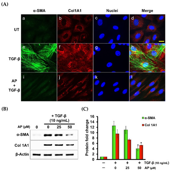 AP reduces the TGF-β1-stimulated expression of α-SMA and component of type I collagen (Col1A1). (A) Immunofluorescence staining of α-SMA (green) and Col1A1 (red) of HPDFs (untreated, TGF-β1-treated, or TGF-β1-treated with the presence of 50 μM of AP) at 48 h. Nuclei were counterstained with DAPI (blue). Figure A(a–d) present the untreated cells showing α-SMA staining, Col1A1staining, DAPI staining, and merged images, respectively. Figure A(e–h) present TGF-β1-treated cells showing α-SMA staining, Col1A1staining, DAPI staining, and merged images, respectively. Figure A(i–l) present cells treated with TGF-β1 and 50 μM of AP showing α-SMA staining, Col1A1staining, DAPI staining, and merged images, respectively. (B) Western blot analysis showing dose-dependent effects of AP on reducing the TGF-β1-induced expression of α-SMA and Col1A1. β-Actin was used as a loading control and for normalization. (C) Quantitative analysis of the Western blot band intensity of α-SMA and Col1A1 of HPDFs (untreated, TGF-β1-treated, or TGF-β1-treated with the presence of 25 and 50 μM of AP) at 48 h. Scale bar = 500 µm. * p < 0.05 compared to TGF-β1-treated HPDFs.
