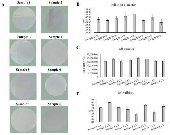 Then, eight UC−MSC lines from eight individuals were used to fabricate UC−MSC sheets following the optimized production process, all of which were able to successfully fabricate UC−MSC sheets with the appearance of a white round sheet structure, smooth surface, and neat edges (Figure 1A). The diameter of the UC−MSC sheets was between 39 mm and 43 mm (Figure 1B). The Acridine Orange and Propidium Iodide (AOPI) staining results showed that the cell amount of one UC−MSC sheet was between 40 and 50 million (Figure 1C). The cell viability of all eight batches of UC−MSC sheets was more than 85% (Figure 1D). All of these showed that the UC−MSC sheet production process developed here was stable with a broad spectrum, which could be used for large-scale UC−MSC sheet production.