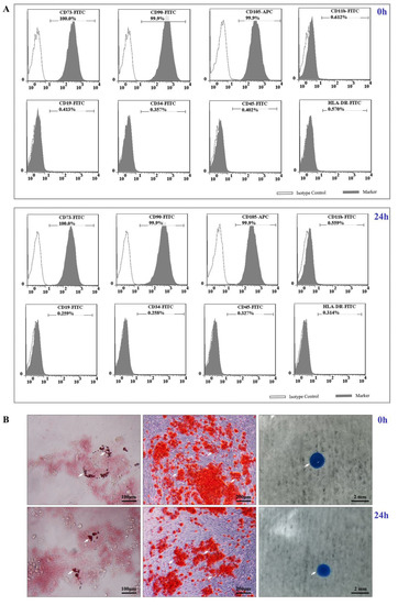 Cell characteristic tests of UC−MSC sheets. (A) Cell surface marker expression of freshly and 24 h preserved cell sheets. (B) Representative results of induced adipogenic (white arrows point to lipid droplets stained with oil red), osteogenic (white arrows point to calcium nodules stained with alizarin red), and chondrogenic (white arrows point to cartilage stained with alcian blue) differentiation of freshly and 24 h preserved cell sheets.