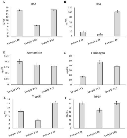 Detection of residues of high-risk substances. (A) Bovine serum albumin (BSA). (B) Human serum albumin (HSA). (C) Gentamicin. (D) Fibrinogen. (E) TrypLE. (F) Basic fibroblast growth factor (bFGF).