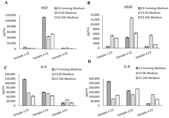 Hepatocyte growth factor (HGF) (Invitrogen (Carlsbad, CA, USA)), vascular endothelial growth factor (VEGF) (NOVUS (Centennial, CO, USA)), interleukin-8 (IL-8) (R&D (Minneapolis, MN, USA)), and interleukin-6 (IL-6) (NOVUS) were quantified using commercial enzyme-linked immunosorbent assay (ELISA) kits, following the manufacturer’s instructions.