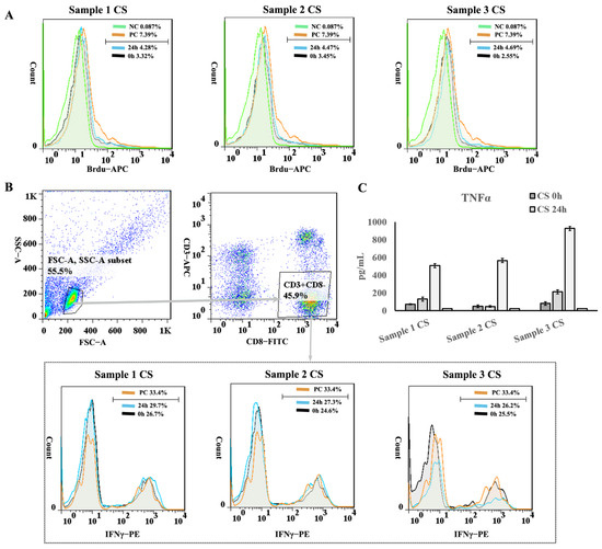 For TNFα detection, the culture medium in the lymphocyte proliferation detection before BrdU staining was harvested for tumor necrosis factor α (TNFα) detection by the Human TNFα ELISA Kit (Invitrogen (Carlsbad, CA, USA)), according to the manufacturer’s descriptions.