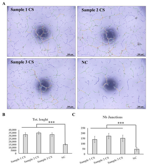 Proangiogenic function test of UC−MSC sheet. (A) ImageJ Angiogenesis Analyzer was used to quantify endothelial tube formation. Images were taken using an inverted microscope and analyzed using an angiogenesis analyzer. Yellow lines represent tubes that connect together to different junctions; green lines represent branches; dark blue represents isolated tubes; red circles represent the master junction points. (B) Statistical results of Nb junctions. (C) Statistical results of total length. *** represent p < 0.01.