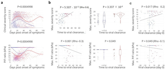 Time to viral clearance correlates with disease severity. (a). Kinetics of daily clinical severity scores and PO2/FiO2 (P/F) ratios: kinetics in relation to the time post onset of symptoms in days, per patient per groups with rapid: ≤ 21 days (blue lines/dots) and delayed: > 21 days viral clearance (red lines/dots). Lines indicate non-linear group trends. Spline regression with bootstrap confidence intervals, 39.9 kPa stands for the minimum disease severity. (b). The maximum (max.) daily clinical severity score and P/F ratio per patient in relation to time to viral clearance (days), defined as the last positive PCR. Spearman’s rank correlation (rho), and Mann–Whitney U test (violin plots). (c). Viral clearance precedes critical illness. Number of days between viral clearance (vertical line, day 0) in relation to the maximum severity scores and to P/F ratio, respectively. Viral clearance ≤ 21 days (blue lines/dots)/> 21 days (red lines/dot). Spearman’s rank correlation (rho), n = 91 patients.
