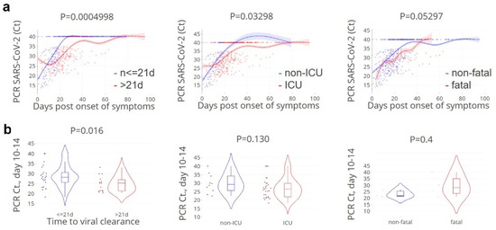 As anticipated, lower SARS-CoV-2 PCR Ct-values (higher viral loads) at day 10–14 after onset of symptoms was significantly associated with time to viral clearance, but also with ICU admission and fatality (Figure 2).